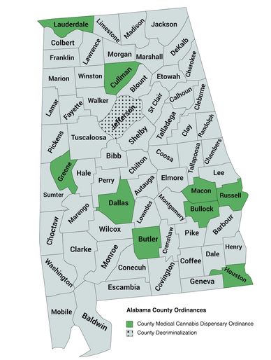 The Alabama Medical Cannabis Commission has received ordinances or resolutions from the following counties listed below. The Commission, however, does not provide any opinion or advice regarding the compliance of any specific ordinance or resolution with the requirements of Alabama law, including Ala. Code § 20-2A-51.